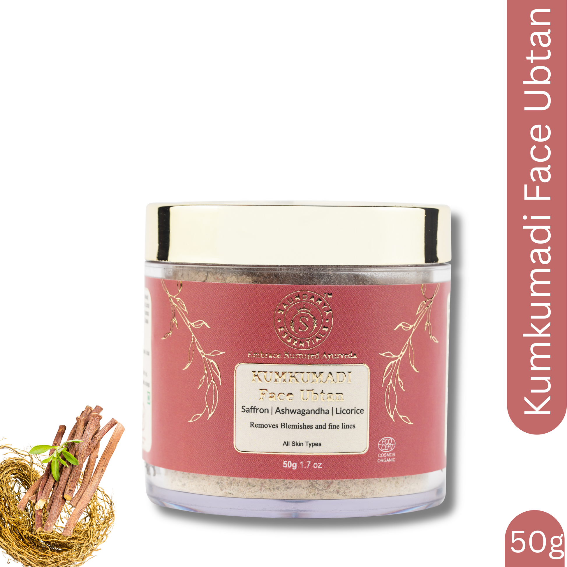 Experience the ultimate in natural skincare with Kumkumadi Face Ubtan, an Ayurvedic blend of herbs and botanicals designed to cleanse, exfoliate, and brighten your complexion. Made with ingredients like Green Gram, Saffron, Rose Petals, and Multani Mitti, this gentle face pack detoxifies, reduces dark spots, and enhances your skin's natural glow.