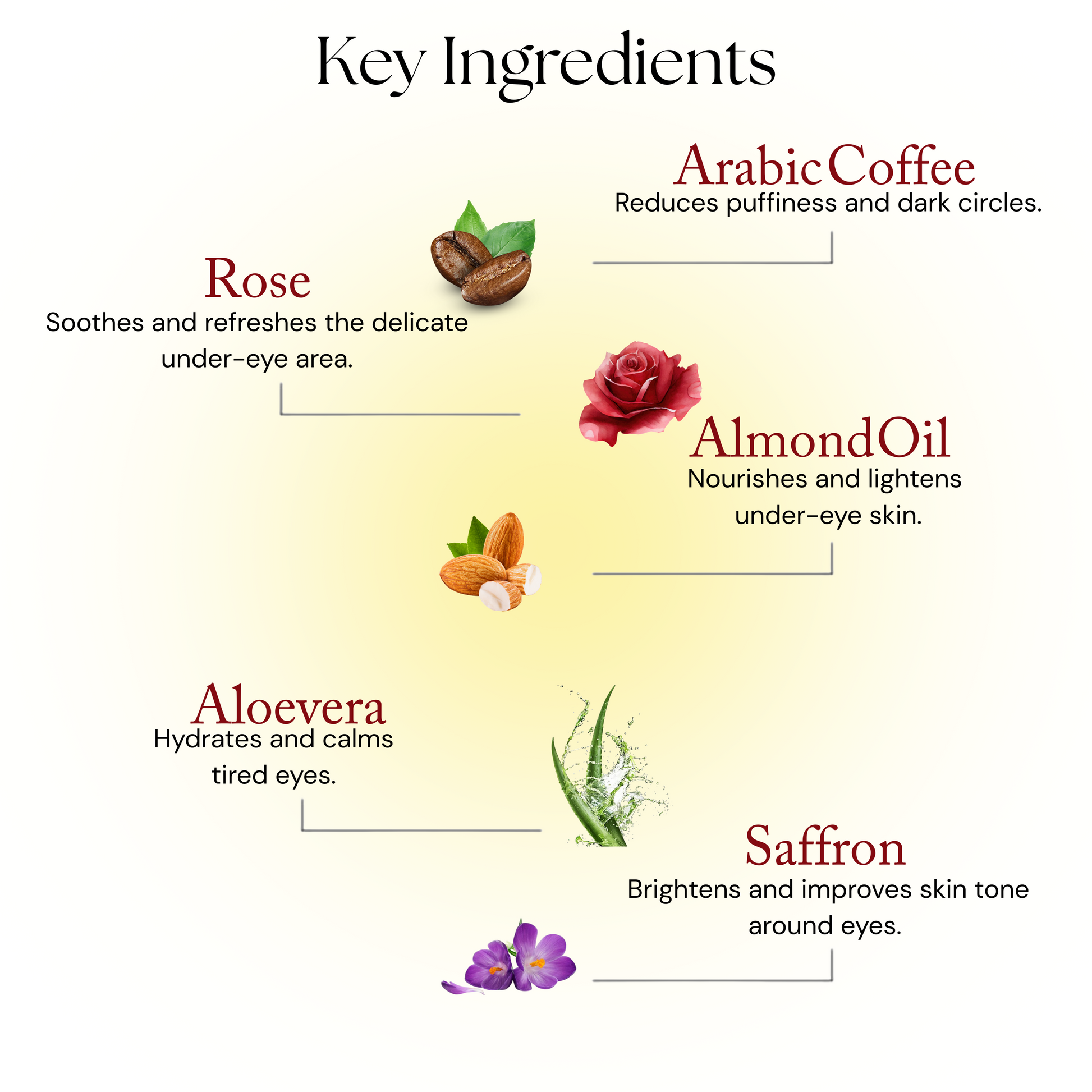 1.     Reduces Dark Circles: The brightening properties of Saffron help lighten dark circles and even out skin tone, giving your eyes a fresher look.