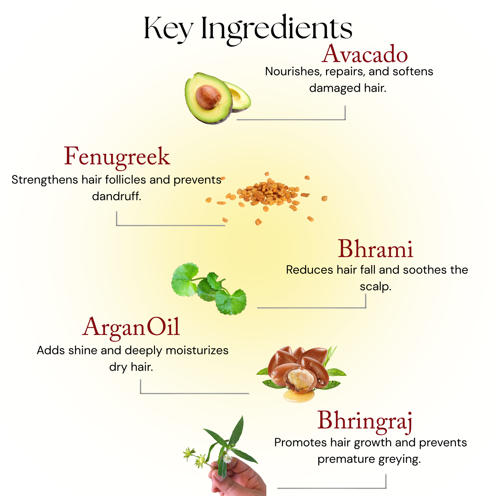Coconut Oil Known for its deep-penetrating properties, it reduces protein loss, prevents breakage, and boosts shine. |