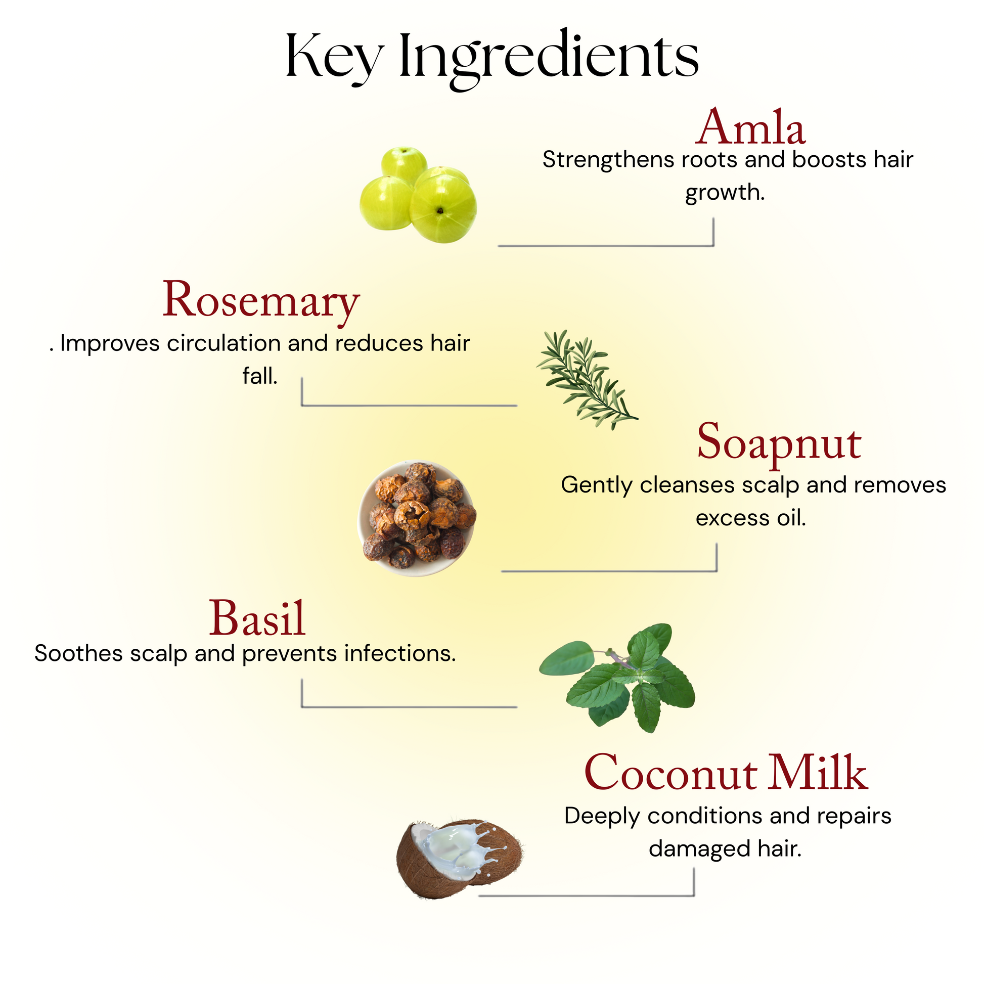 This herbal blend uses Amla to strengthen roots and prevent premature graying, while Reetha provides a gentle, natural lather that removes dirt and excess oil without drying out the scalp. Shikakai works as a natural conditioner, detangling and adding a soft shine, while Coconut Milk deeply hydrates each strand, preventing dryness and frizz. Fenugreek rounds out the formula with its ability to reduce hair fall, soothe the scalp, and add volume.